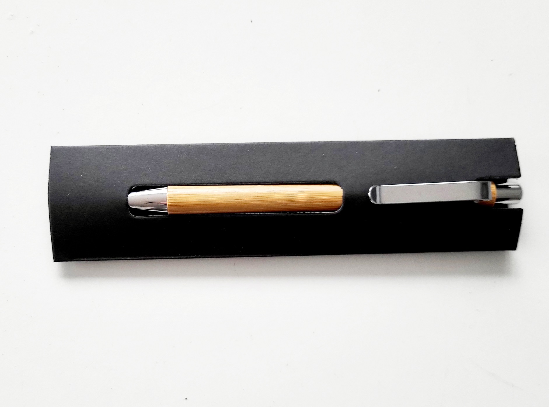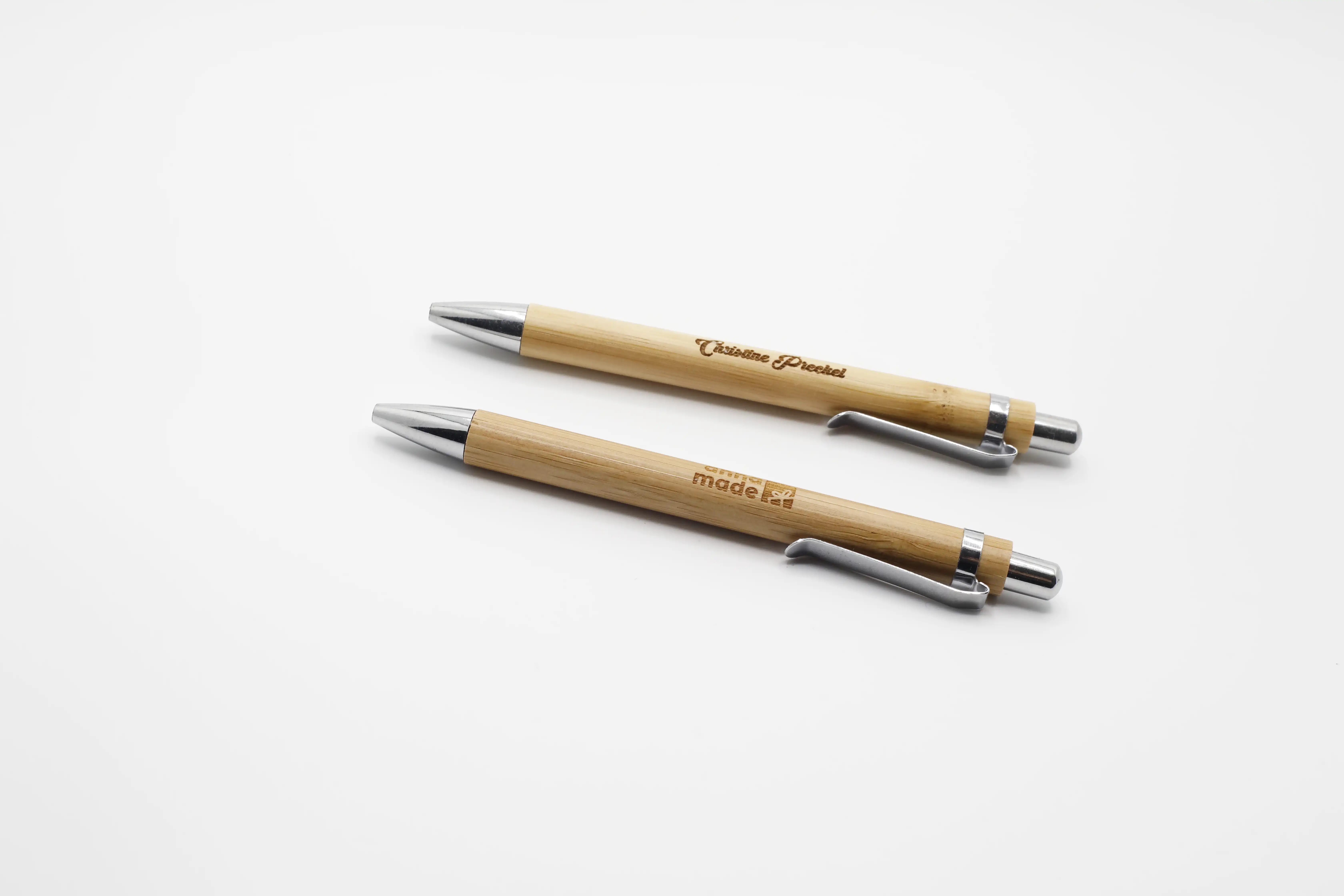 Eine Kombination aus Bambus und edlen Elementen. Druckkugelschreiber mit Schaft aus Bambus, chromefarbenem Drücker, Spitze und Metallclip.