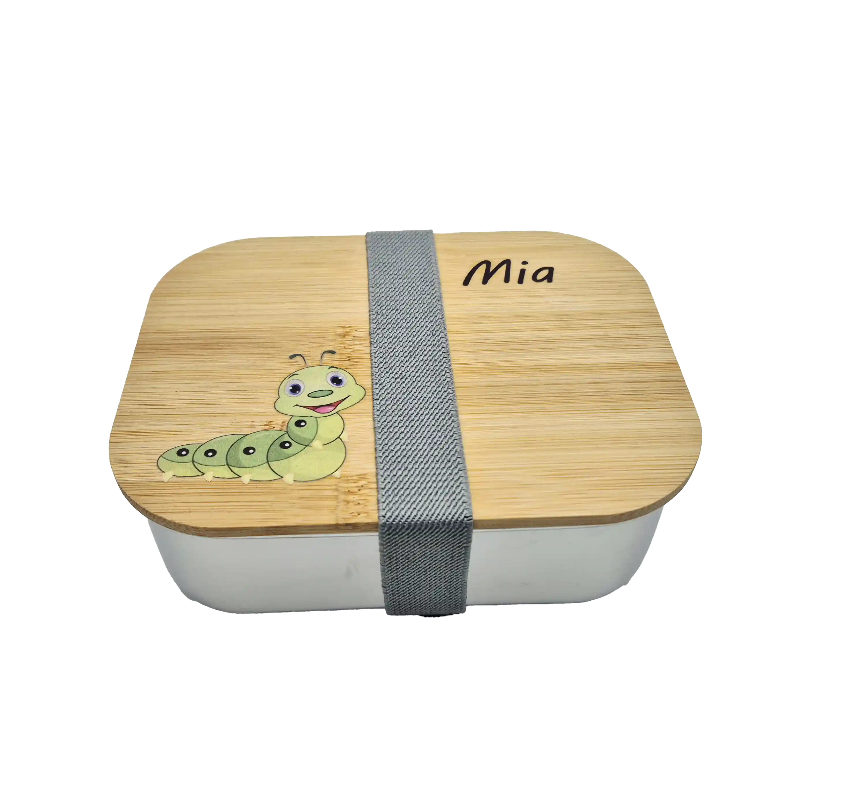 Die Brotdose aus Edelstahl mit Bambusdeckel und einem Spannband ist dein alltäglicher Begleiter, egal ob im Büro oder für unterwegs. Hat ein Fassungsvermögen von 800 ml und die Maße 13 x 16,9 x 6 cm, erhältlich mit Wunschmotiv und Name bedruckt.
